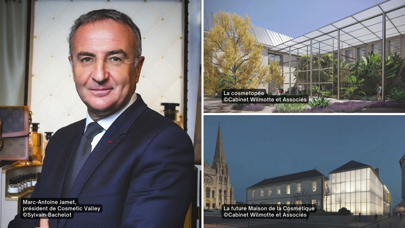 Marc-Antoine Jamet, président de Cosmetic Valley, évoque l'importance économique du secteur cosmétique, et l'implantation à Chartres de la Maison de la Cosmétique, qui ouvrira ses portes fin 2028 face à la cathédrale.